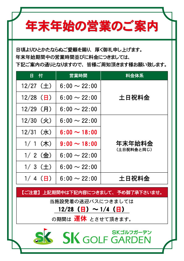 年末年始期間中の営業時間並びに料金につきましては、下記の通りとなりますので皆様ご周知頂けます様お願い致します。